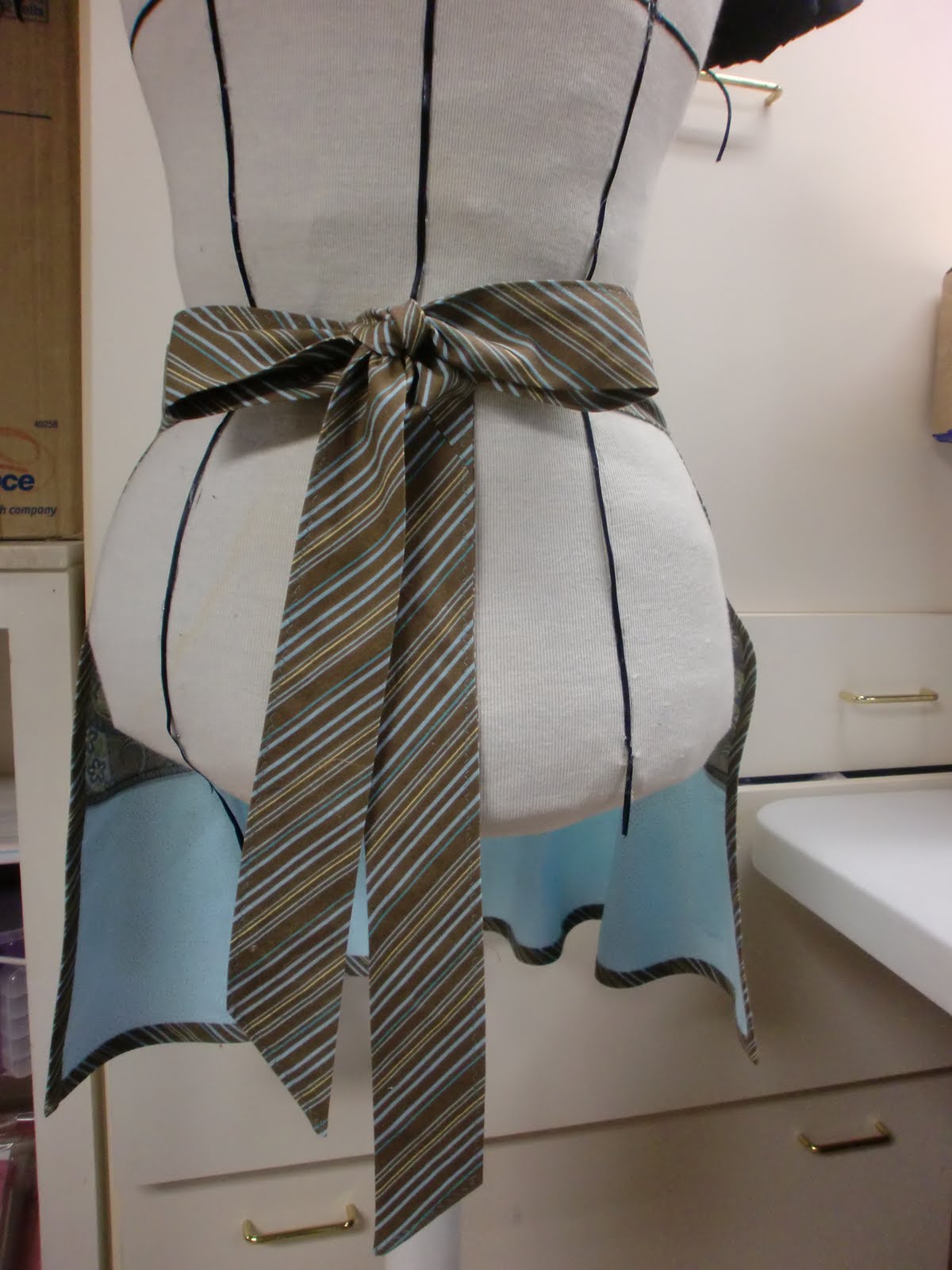 Left them was to create the top finish and tie ends – which those great directions said to do with bias tape! Yuck!!!!! I created a ‘waistband’ of the stripe fabric – on the bias – cut it 5″ wide. You can see here that I also knew to interface that band across the front. That is the white piece here in this photo.