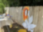After all that graphing and planning, I began to question if I could really pull this off. So….I decided to give it a try behind our shed on the same fence. It was SO MUCH FUN, and turned out pretty well. I shared it with a couple of friends and family members who all said it was good, so I figured, why not? Here arfe pictures of both the primer painting and my final ‘TEST FLOWER’.