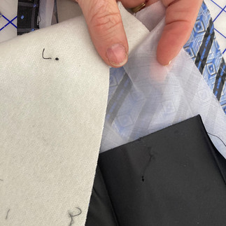 This shirt had a nice V-neck, and I decided to just keep it, but let the tie overlap that neckline as you can see in this photo of the neckline. Before using the tie, I take it apart, removing the stitching holding it together down the center back, and taking out the bias interfacing. I don't throw that away though - as it makes GREAT sleeve heads in jackets. See the first photo in the strip of 3 photos below.