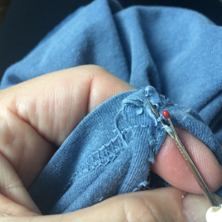 3. Locate Pocket as in the photo, flush with top of T-Shirt hemmed edge, onto a single layer of the hemmed edge piece. Stitch back on, following the previous stitching. To do so, start at the innermost edge of the uppermost triangle of stitching and work your way around. Be sure to backstitch to secure. This patch pocket will work perfectly for your ID. This is actually a double layer pocket.